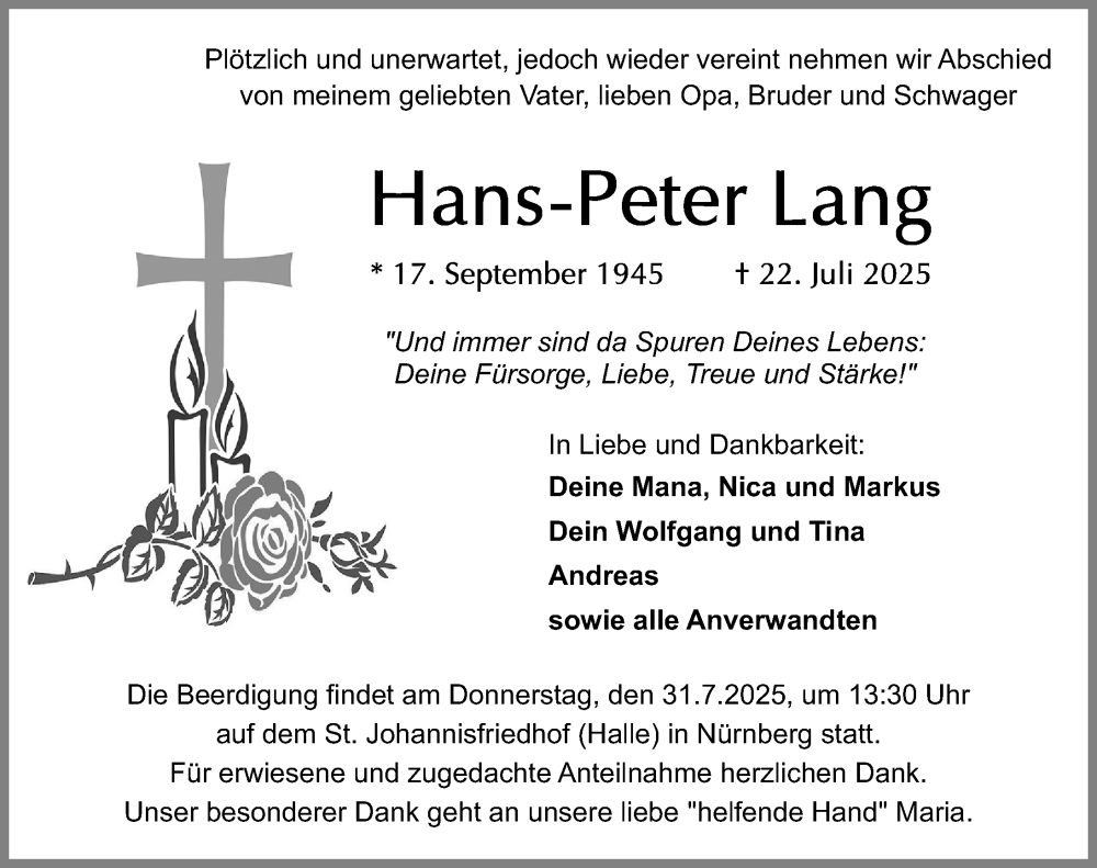 Hier finden Sie alle Traueranzeigen aus der Zeitung, die bisher für Hans-Peter Lang erschienen sind. Weitere Traueranzeigen, die in der Zeitung erscheinen, werden hier ebenfalls aufgelistet