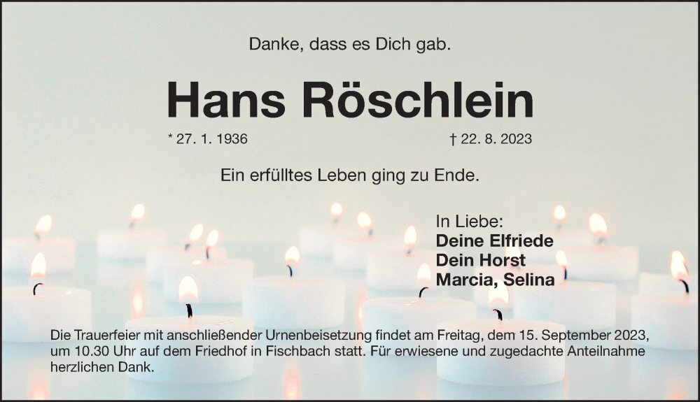 Hier finden Sie alle Traueranzeigen aus der Zeitung, die bisher für Hans Röschlein erschienen sind. Weitere Traueranzeigen, die in der Zeitung erscheinen, werden hier ebenfalls aufgelistet