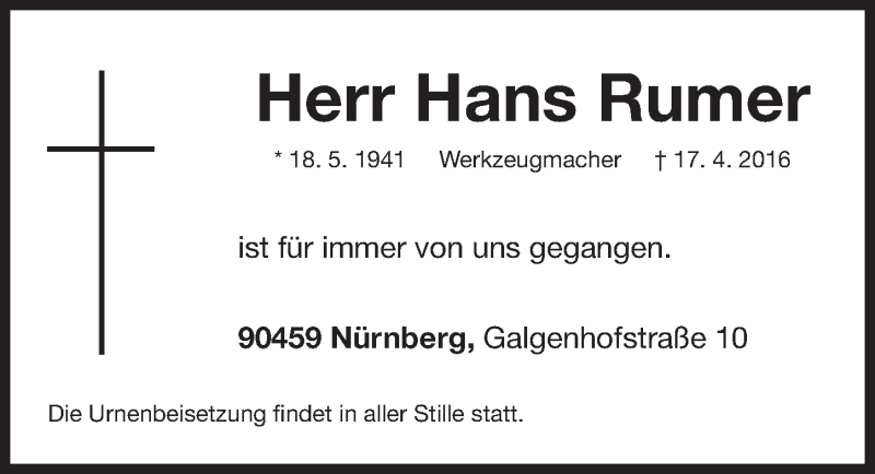 Hier finden Sie alle Traueranzeigen aus der Zeitung, die bisher für Hans Rumer erschienen sind. Weitere Traueranzeigen, die in der Zeitung erscheinen, werden hier ebenfalls aufgelistet