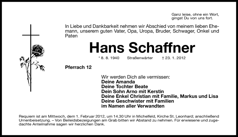 Hier finden Sie alle Traueranzeigen aus der Zeitung, die bisher für Hans Schaffner erschienen sind. Weitere Traueranzeigen, die in der Zeitung erscheinen, werden hier ebenfalls aufgelistet