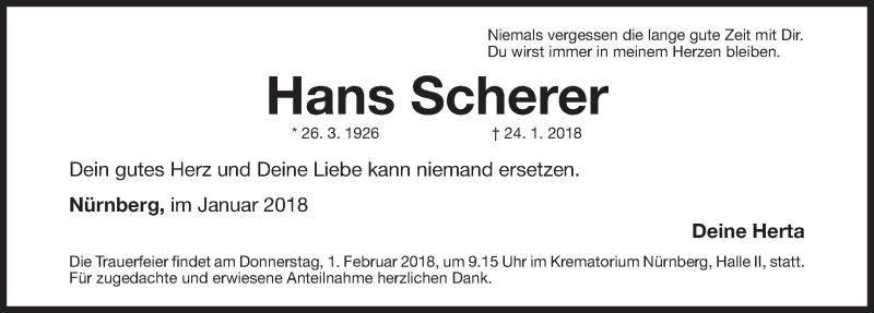Hier finden Sie alle Traueranzeigen aus der Zeitung, die bisher für Hans Scherer erschienen sind. Weitere Traueranzeigen, die in der Zeitung erscheinen, werden hier ebenfalls aufgelistet