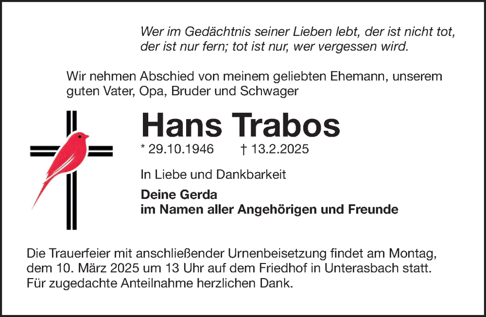 Hier finden Sie alle Traueranzeigen aus der Zeitung, die bisher für Hans Trabos erschienen sind. Weitere Traueranzeigen, die in der Zeitung erscheinen, werden hier ebenfalls aufgelistet