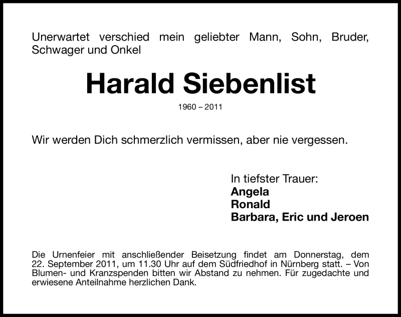 Hier finden Sie alle Traueranzeigen aus der Zeitung, die bisher für Harald Siebenlist erschienen sind. Weitere Traueranzeigen, die in der Zeitung erscheinen, werden hier ebenfalls aufgelistet