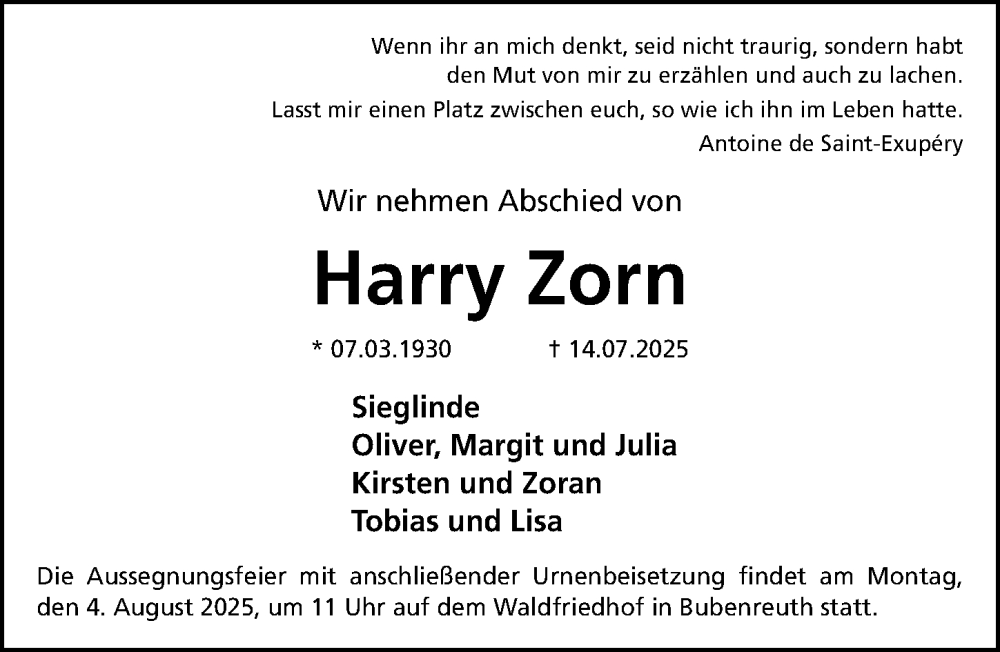 Hier finden Sie alle Traueranzeigen aus der Zeitung, die bisher für Harry Zorn erschienen sind. Weitere Traueranzeigen, die in der Zeitung erscheinen, werden hier ebenfalls aufgelistet