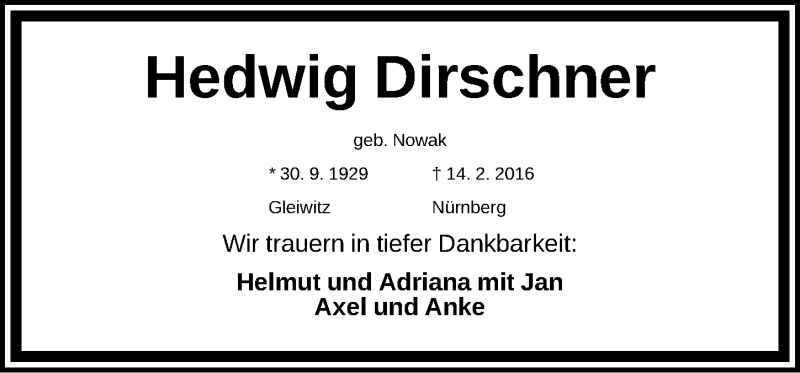 Hier finden Sie alle Traueranzeigen aus der Zeitung, die bisher für Hedwig Dirschner erschienen sind. Weitere Traueranzeigen, die in der Zeitung erscheinen, werden hier ebenfalls aufgelistet