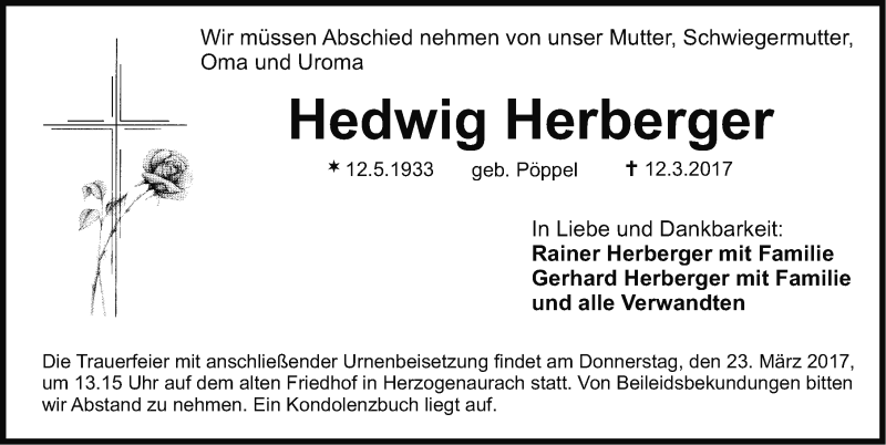Hier finden Sie alle Traueranzeigen aus der Zeitung, die bisher für Hedwig Herberger erschienen sind. Weitere Traueranzeigen, die in der Zeitung erscheinen, werden hier ebenfalls aufgelistet