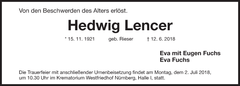 Hier finden Sie alle Traueranzeigen aus der Zeitung, die bisher für Hedwig Lencer erschienen sind. Weitere Traueranzeigen, die in der Zeitung erscheinen, werden hier ebenfalls aufgelistet