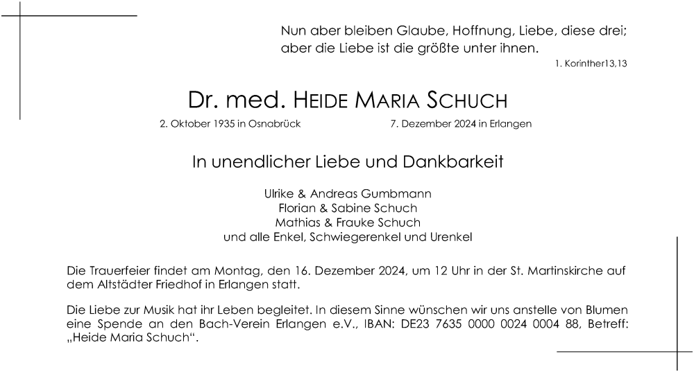 Hier finden Sie alle Traueranzeigen aus der Zeitung, die bisher für Heide Maria Schuch erschienen sind. Weitere Traueranzeigen, die in der Zeitung erscheinen, werden hier ebenfalls aufgelistet