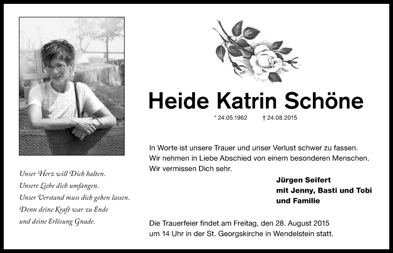 Hier finden Sie alle Traueranzeigen aus der Zeitung, die bisher für Heide Katrin Schöne erschienen sind. Weitere Traueranzeigen, die in der Zeitung erscheinen, werden hier ebenfalls aufgelistet