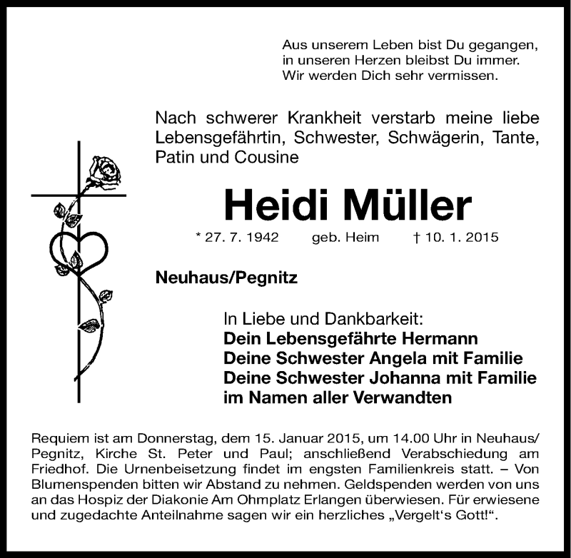 Hier finden Sie alle Traueranzeigen aus der Zeitung, die bisher für Heidi Müller erschienen sind. Weitere Traueranzeigen, die in der Zeitung erscheinen, werden hier ebenfalls aufgelistet