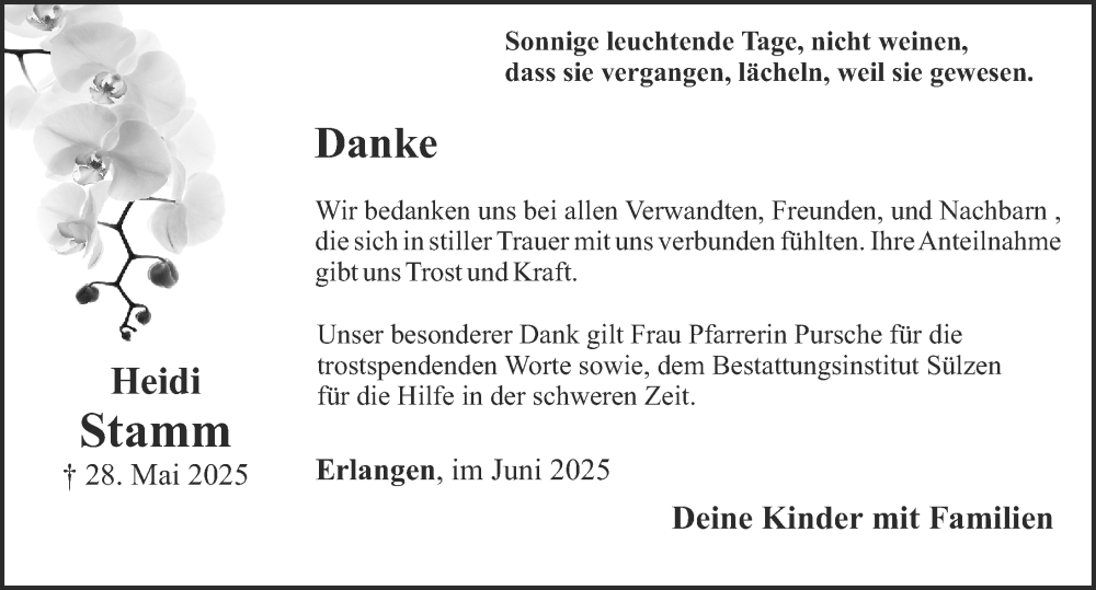 Hier finden Sie alle Traueranzeigen aus der Zeitung, die bisher für Heidi Stamm erschienen sind. Weitere Traueranzeigen, die in der Zeitung erscheinen, werden hier ebenfalls aufgelistet