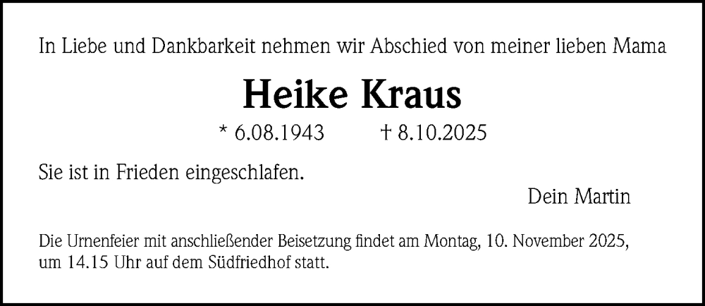 Hier finden Sie alle Traueranzeigen aus der Zeitung, die bisher für Heike Kraus erschienen sind. Weitere Traueranzeigen, die in der Zeitung erscheinen, werden hier ebenfalls aufgelistet