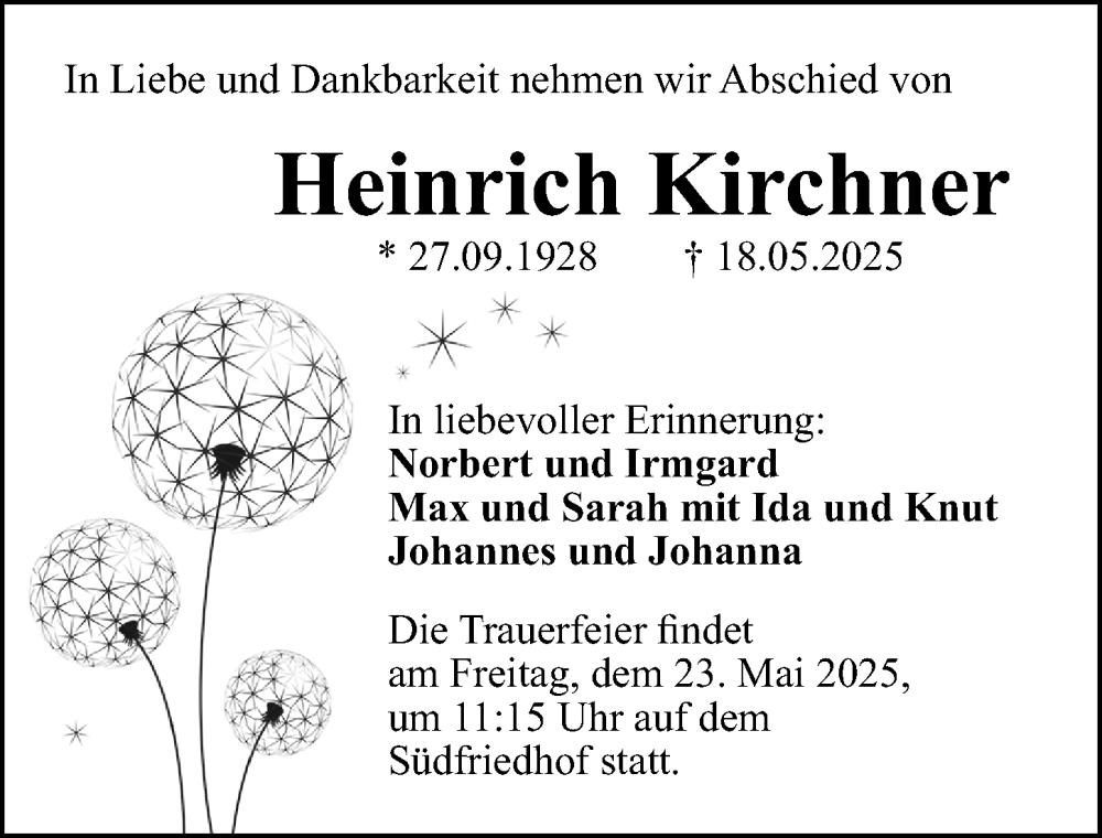 Hier finden Sie alle Traueranzeigen aus der Zeitung, die bisher für Heinrich Kirchner erschienen sind. Weitere Traueranzeigen, die in der Zeitung erscheinen, werden hier ebenfalls aufgelistet