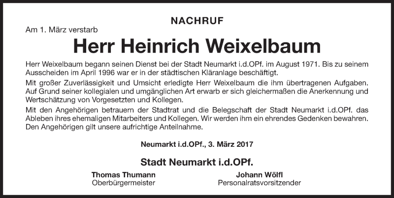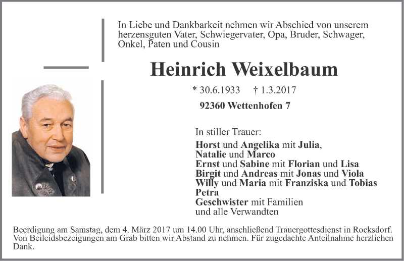 Hier finden Sie alle Traueranzeigen aus der Zeitung, die bisher für Heinrich Weixelbaum erschienen sind. Weitere Traueranzeigen, die in der Zeitung erscheinen, werden hier ebenfalls aufgelistet