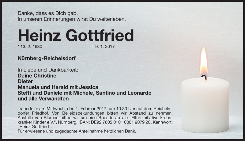 Hier finden Sie alle Traueranzeigen aus der Zeitung, die bisher für Heinz Gottfried erschienen sind. Weitere Traueranzeigen, die in der Zeitung erscheinen, werden hier ebenfalls aufgelistet