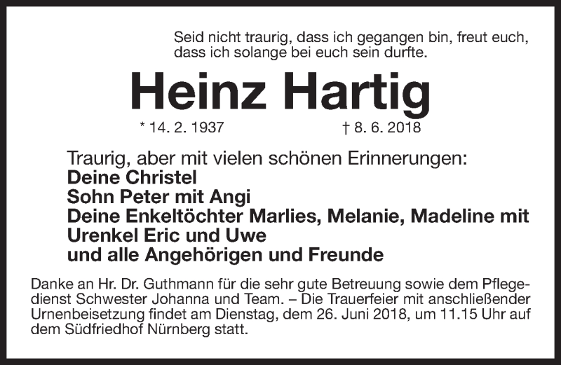 Hier finden Sie alle Traueranzeigen aus der Zeitung, die bisher für Heinz Hartig erschienen sind. Weitere Traueranzeigen, die in der Zeitung erscheinen, werden hier ebenfalls aufgelistet