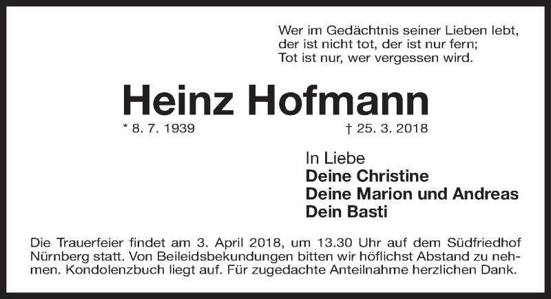 Hier finden Sie alle Traueranzeigen aus der Zeitung, die bisher für Heinz Hofmann erschienen sind. Weitere Traueranzeigen, die in der Zeitung erscheinen, werden hier ebenfalls aufgelistet