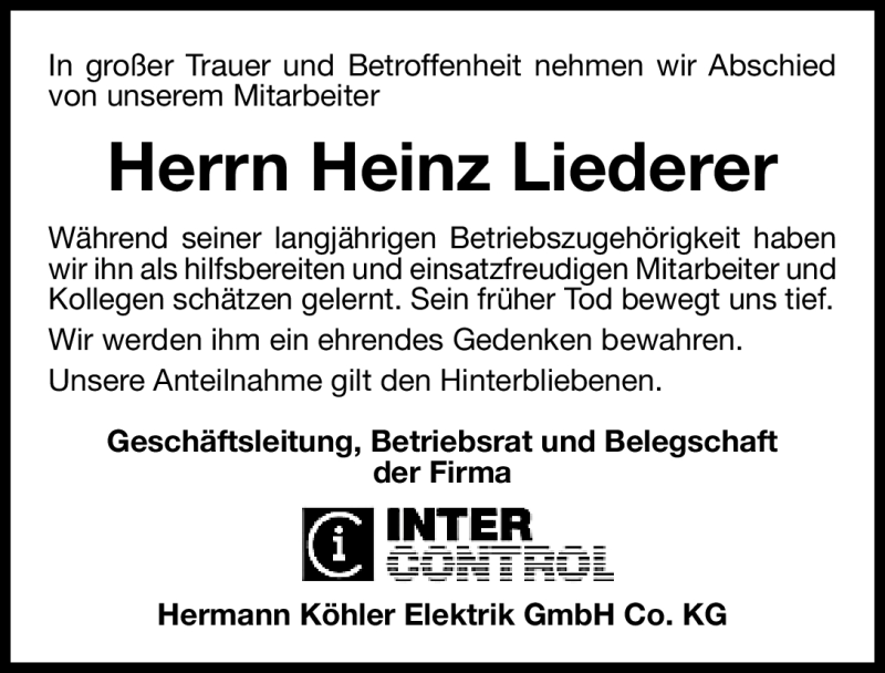 Hier finden Sie alle Traueranzeigen aus der Zeitung, die bisher für Heinz Liederer erschienen sind. Weitere Traueranzeigen, die in der Zeitung erscheinen, werden hier ebenfalls aufgelistet