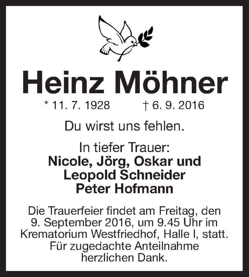 Hier finden Sie alle Traueranzeigen aus der Zeitung, die bisher für Heinz Möhner erschienen sind. Weitere Traueranzeigen, die in der Zeitung erscheinen, werden hier ebenfalls aufgelistet