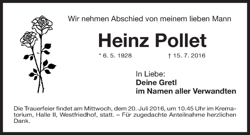 Hier finden Sie alle Traueranzeigen aus der Zeitung, die bisher für Heinz Pollet erschienen sind. Weitere Traueranzeigen, die in der Zeitung erscheinen, werden hier ebenfalls aufgelistet