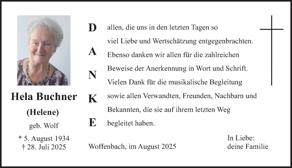 Hier finden Sie alle Traueranzeigen aus der Zeitung, die bisher für Helene Buchner erschienen sind. Weitere Traueranzeigen, die in der Zeitung erscheinen, werden hier ebenfalls aufgelistet