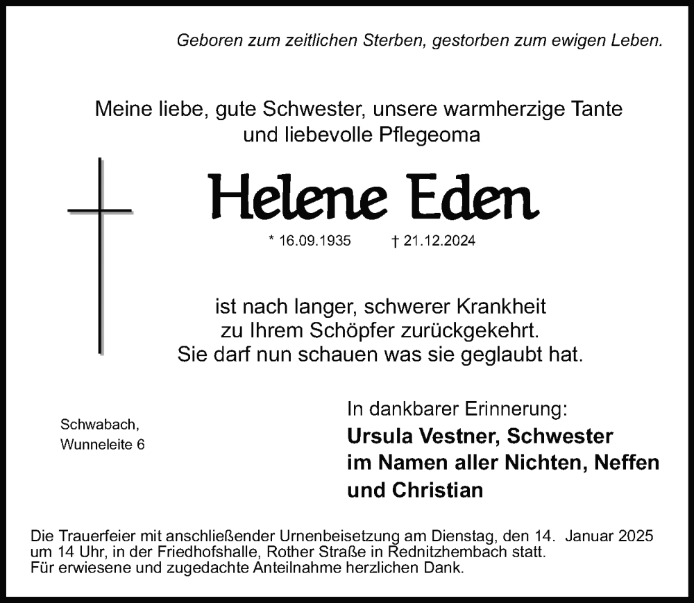 Hier finden Sie alle Traueranzeigen aus der Zeitung, die bisher für Helene Eden erschienen sind. Weitere Traueranzeigen, die in der Zeitung erscheinen, werden hier ebenfalls aufgelistet