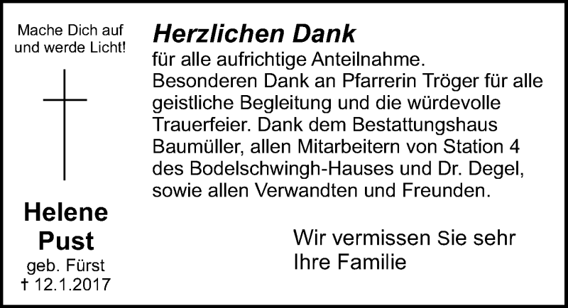 Hier finden Sie alle Traueranzeigen aus der Zeitung, die bisher für Helene Pust erschienen sind. Weitere Traueranzeigen, die in der Zeitung erscheinen, werden hier ebenfalls aufgelistet