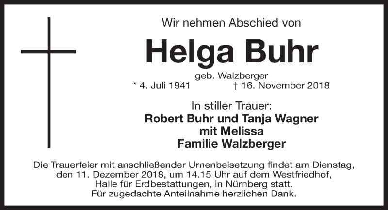 Hier finden Sie alle Traueranzeigen aus der Zeitung, die bisher für Helga Buhr erschienen sind. Weitere Traueranzeigen, die in der Zeitung erscheinen, werden hier ebenfalls aufgelistet
