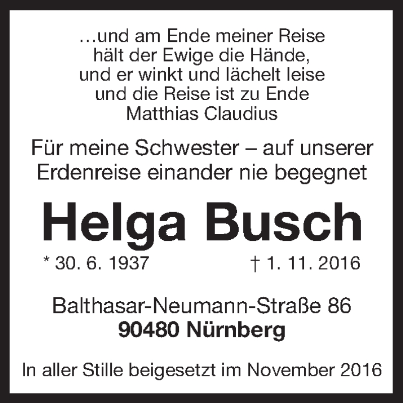 Hier finden Sie alle Traueranzeigen aus der Zeitung, die bisher für Helga Busch erschienen sind. Weitere Traueranzeigen, die in der Zeitung erscheinen, werden hier ebenfalls aufgelistet