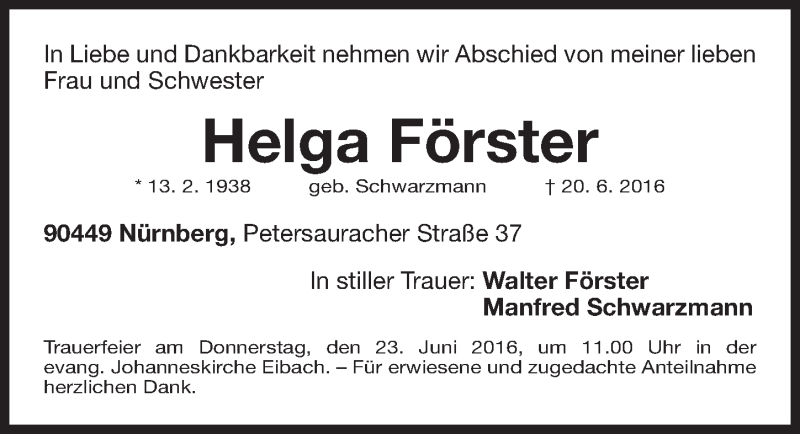 Hier finden Sie alle Traueranzeigen aus der Zeitung, die bisher für Helga Förster erschienen sind. Weitere Traueranzeigen, die in der Zeitung erscheinen, werden hier ebenfalls aufgelistet