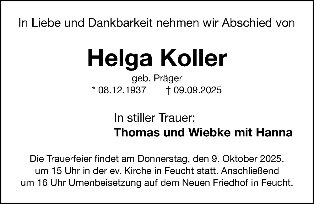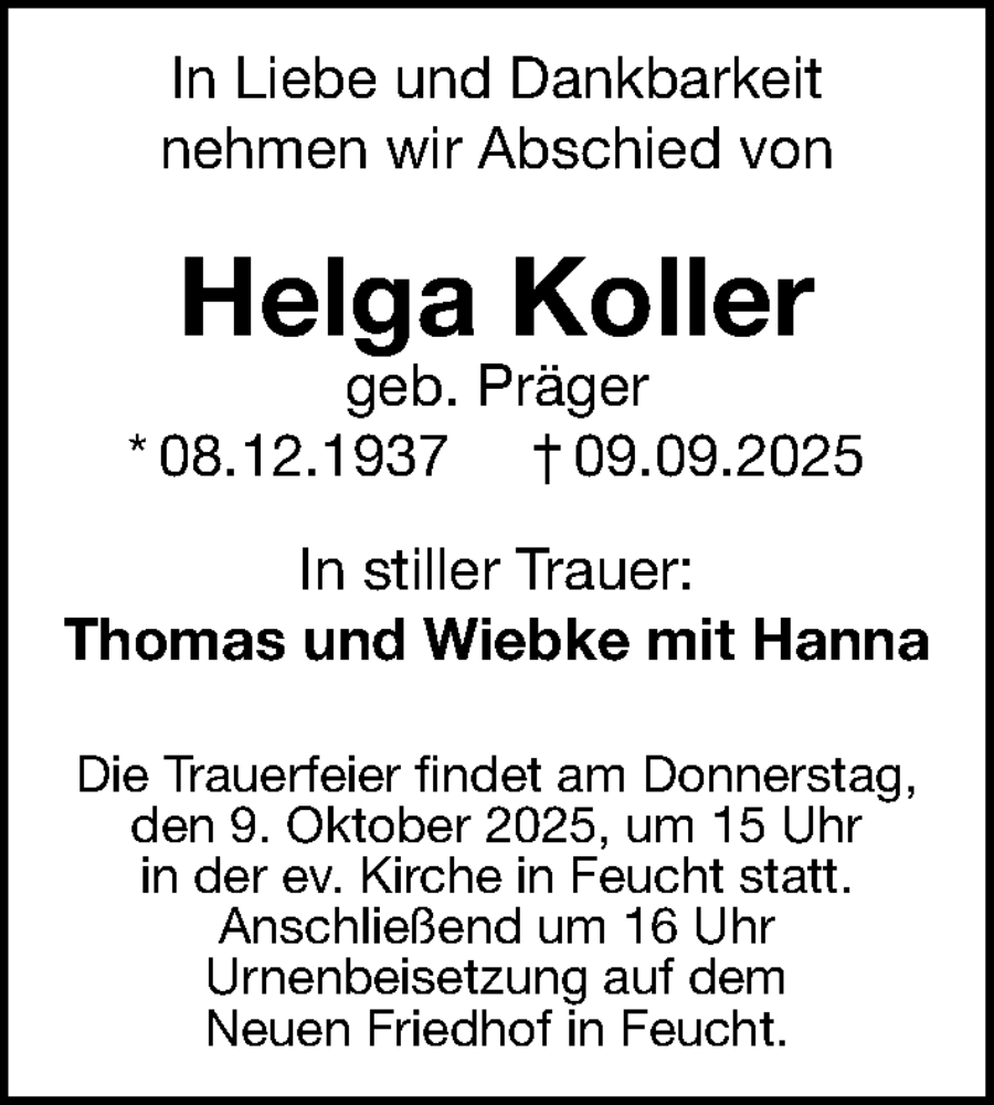 Hier finden Sie alle Traueranzeigen aus der Zeitung, die bisher für Helga Koller erschienen sind. Weitere Traueranzeigen, die in der Zeitung erscheinen, werden hier ebenfalls aufgelistet