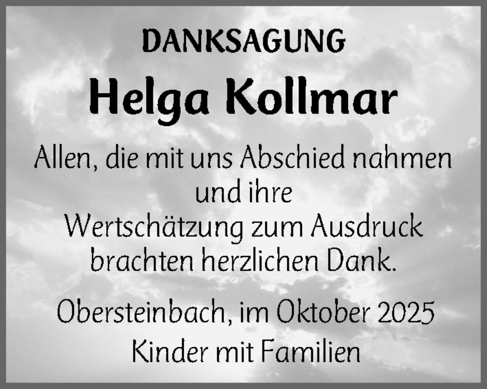 Hier finden Sie alle Traueranzeigen aus der Zeitung, die bisher für Helga Kollmar erschienen sind. Weitere Traueranzeigen, die in der Zeitung erscheinen, werden hier ebenfalls aufgelistet