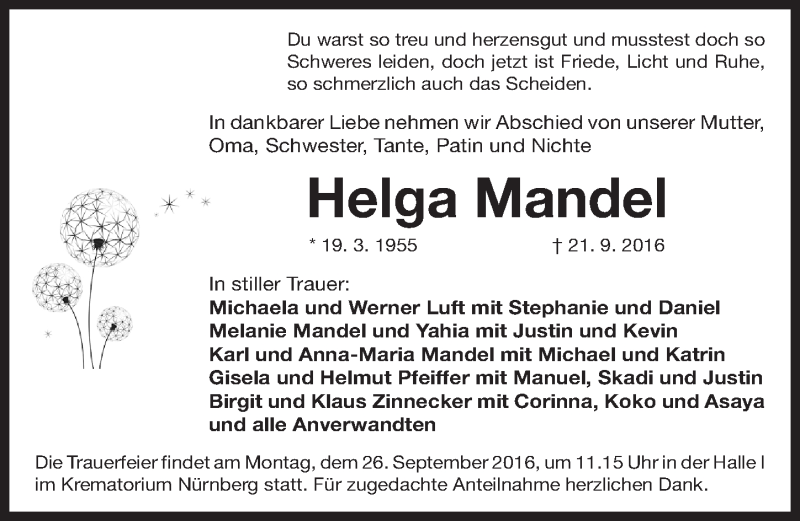Hier finden Sie alle Traueranzeigen aus der Zeitung, die bisher für Helga Mandel erschienen sind. Weitere Traueranzeigen, die in der Zeitung erscheinen, werden hier ebenfalls aufgelistet