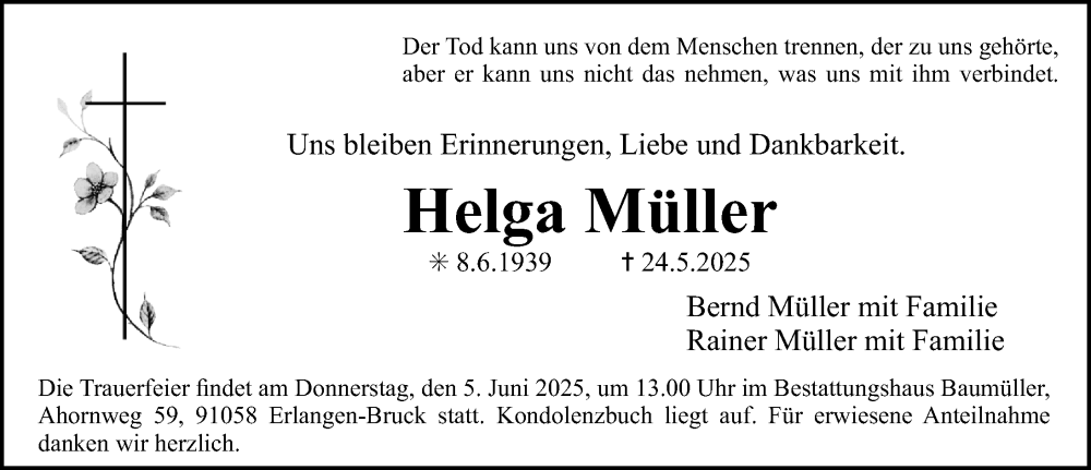 Hier finden Sie alle Traueranzeigen aus der Zeitung, die bisher für Helga Müller erschienen sind. Weitere Traueranzeigen, die in der Zeitung erscheinen, werden hier ebenfalls aufgelistet