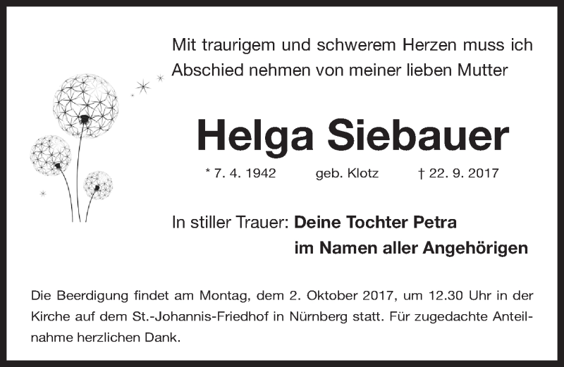Hier finden Sie alle Traueranzeigen aus der Zeitung, die bisher für Helga Siebauer erschienen sind. Weitere Traueranzeigen, die in der Zeitung erscheinen, werden hier ebenfalls aufgelistet