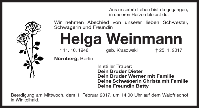 Hier finden Sie alle Traueranzeigen aus der Zeitung, die bisher für Helga Weinmann erschienen sind. Weitere Traueranzeigen, die in der Zeitung erscheinen, werden hier ebenfalls aufgelistet