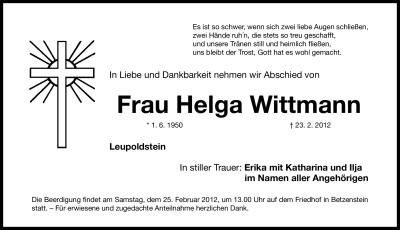 Hier finden Sie alle Traueranzeigen aus der Zeitung, die bisher für Helga Wittmann erschienen sind. Weitere Traueranzeigen, die in der Zeitung erscheinen, werden hier ebenfalls aufgelistet