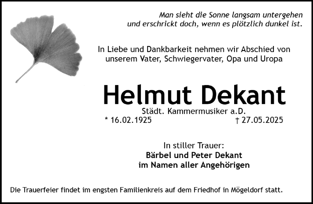 Hier finden Sie alle Traueranzeigen aus der Zeitung, die bisher für Helmut Dekant erschienen sind. Weitere Traueranzeigen, die in der Zeitung erscheinen, werden hier ebenfalls aufgelistet