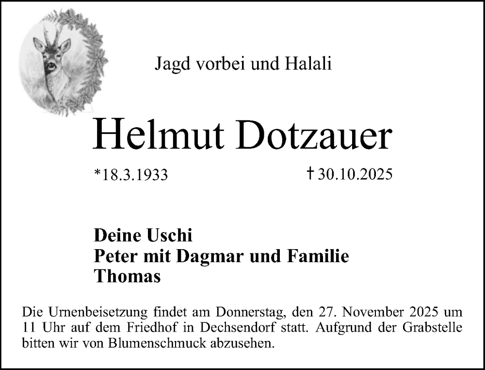 Hier finden Sie alle Traueranzeigen aus der Zeitung, die bisher für Helmut Dotzauer erschienen sind. Weitere Traueranzeigen, die in der Zeitung erscheinen, werden hier ebenfalls aufgelistet
