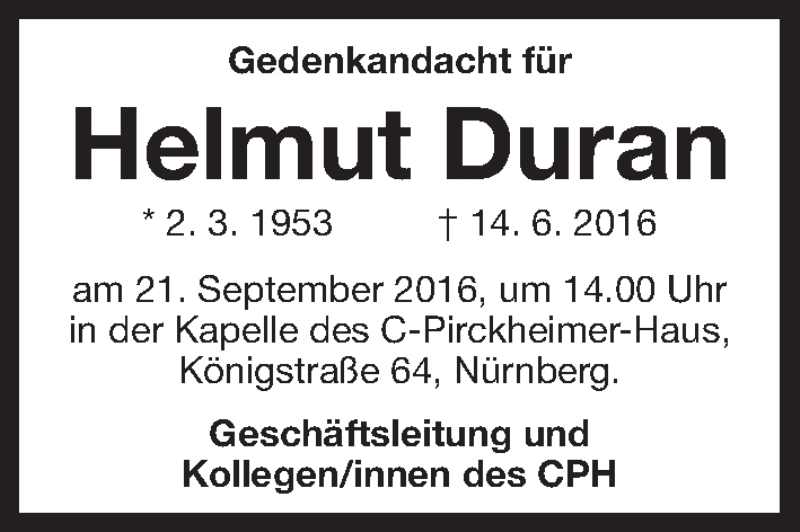 Hier finden Sie alle Traueranzeigen aus der Zeitung, die bisher für Helmut Duran erschienen sind. Weitere Traueranzeigen, die in der Zeitung erscheinen, werden hier ebenfalls aufgelistet