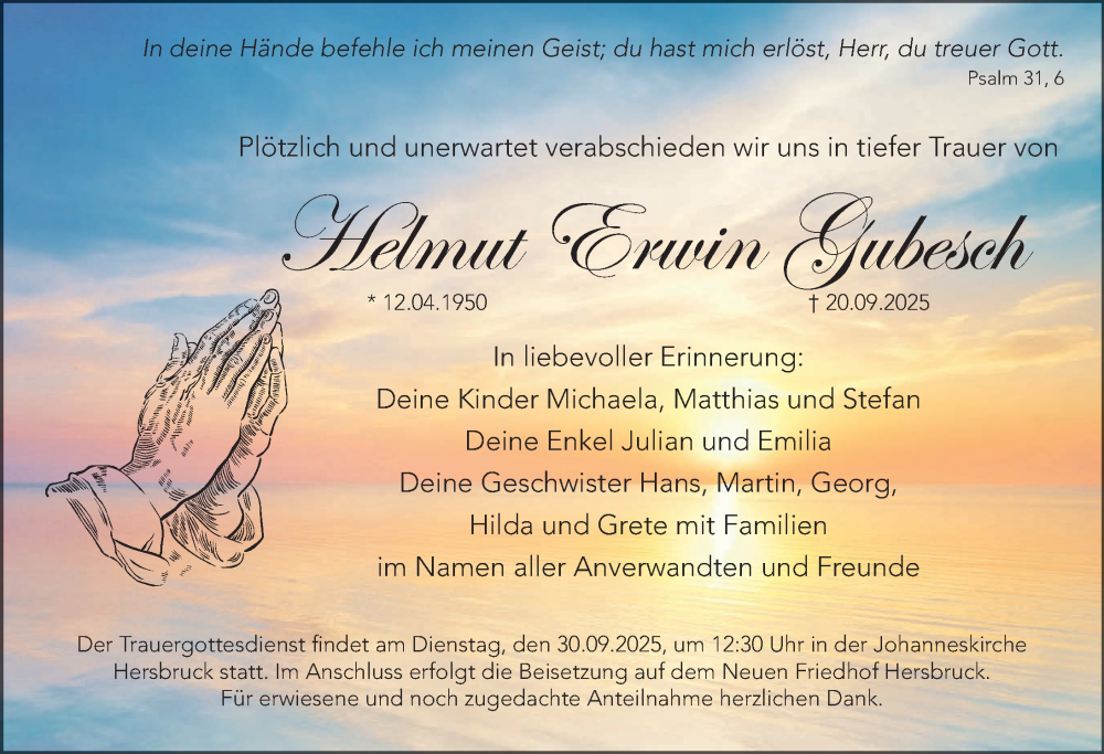 Hier finden Sie alle Traueranzeigen aus der Zeitung, die bisher für Helmut Erwin Gubesch erschienen sind. Weitere Traueranzeigen, die in der Zeitung erscheinen, werden hier ebenfalls aufgelistet