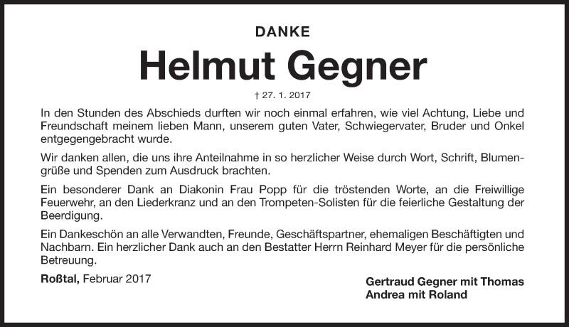 Hier finden Sie alle Traueranzeigen aus der Zeitung, die bisher für Helmut Gegner erschienen sind. Weitere Traueranzeigen, die in der Zeitung erscheinen, werden hier ebenfalls aufgelistet