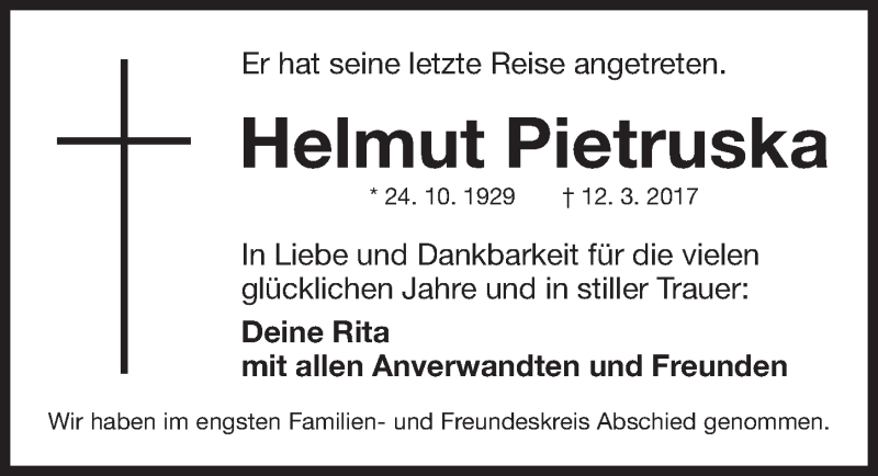 Hier finden Sie alle Traueranzeigen aus der Zeitung, die bisher für Helmut Pietruska erschienen sind. Weitere Traueranzeigen, die in der Zeitung erscheinen, werden hier ebenfalls aufgelistet