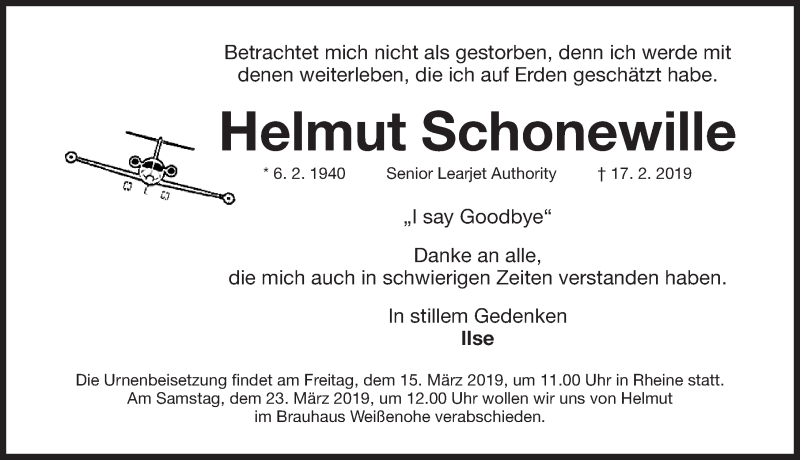 Hier finden Sie alle Traueranzeigen aus der Zeitung, die bisher für Helmut Schonewille erschienen sind. Weitere Traueranzeigen, die in der Zeitung erscheinen, werden hier ebenfalls aufgelistet