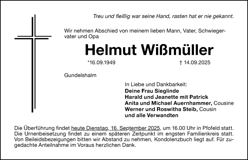 Hier finden Sie alle Traueranzeigen aus der Zeitung, die bisher für Helmut Wißmüller erschienen sind. Weitere Traueranzeigen, die in der Zeitung erscheinen, werden hier ebenfalls aufgelistet