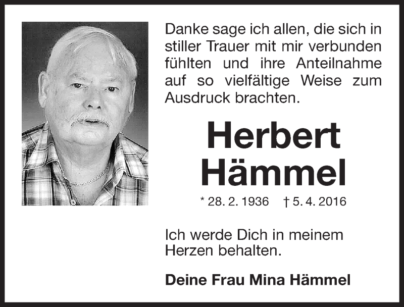 Hier finden Sie alle Traueranzeigen aus der Zeitung, die bisher für Herbert Hämmel erschienen sind. Weitere Traueranzeigen, die in der Zeitung erscheinen, werden hier ebenfalls aufgelistet