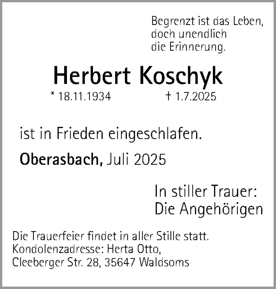 Hier finden Sie alle Traueranzeigen aus der Zeitung, die bisher für Herbert Koschyk erschienen sind. Weitere Traueranzeigen, die in der Zeitung erscheinen, werden hier ebenfalls aufgelistet