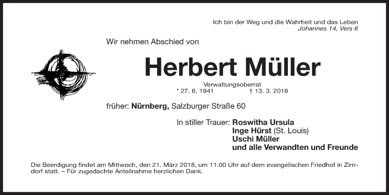 Hier finden Sie alle Traueranzeigen aus der Zeitung, die bisher für Herbert Müller erschienen sind. Weitere Traueranzeigen, die in der Zeitung erscheinen, werden hier ebenfalls aufgelistet