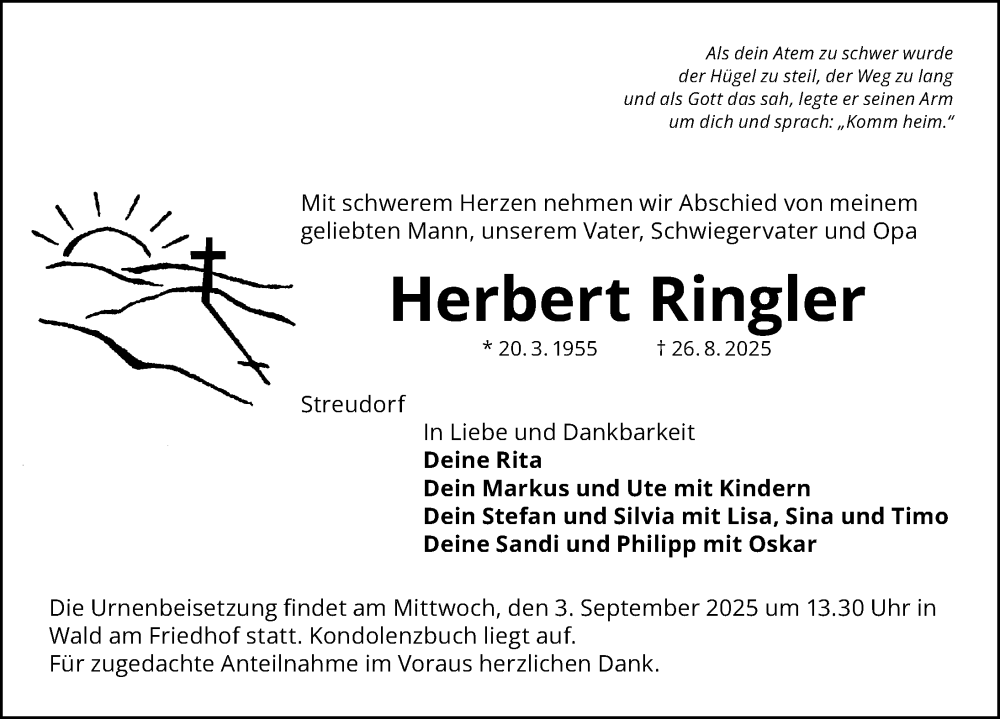 Hier finden Sie alle Traueranzeigen aus der Zeitung, die bisher für Herbert Ringler erschienen sind. Weitere Traueranzeigen, die in der Zeitung erscheinen, werden hier ebenfalls aufgelistet