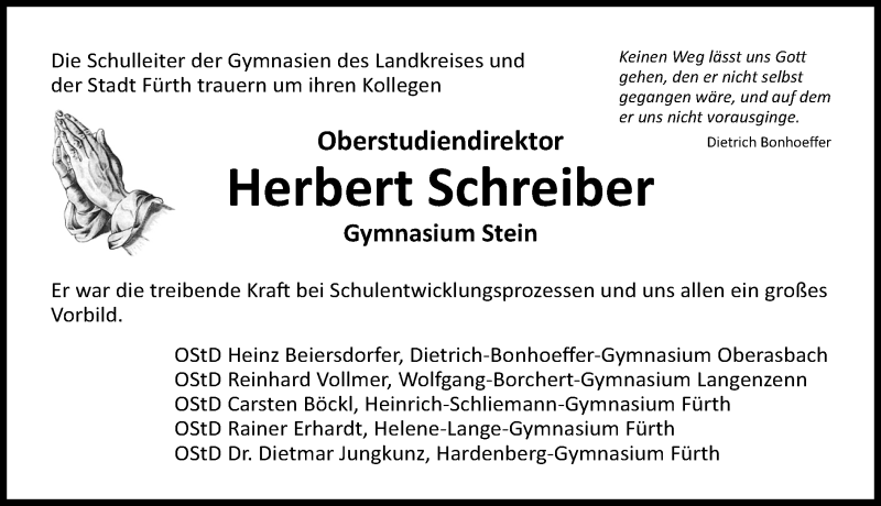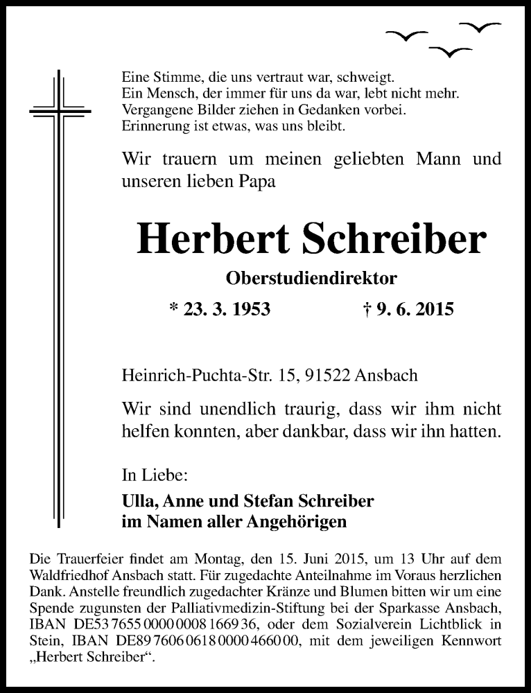 Hier finden Sie alle Traueranzeigen aus der Zeitung, die bisher für Herbert Schreiber erschienen sind. Weitere Traueranzeigen, die in der Zeitung erscheinen, werden hier ebenfalls aufgelistet